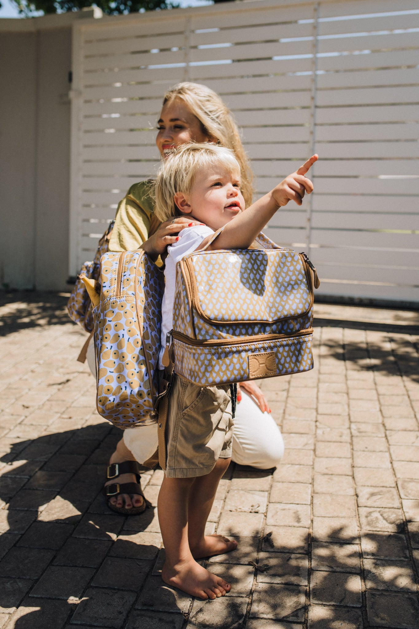 Little boy on his way to school with his Thandana lunch cooler bag - insulated and cute prints.